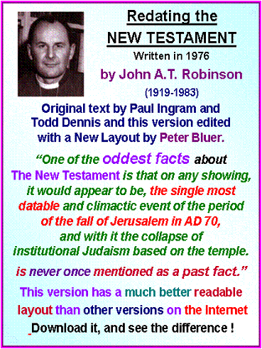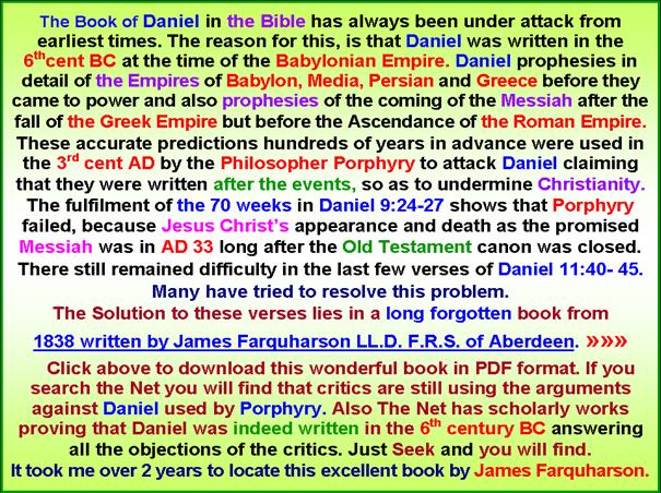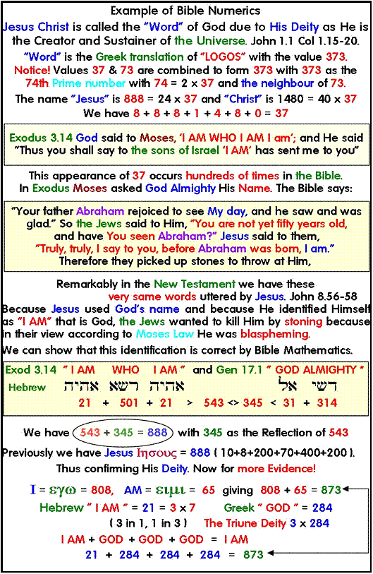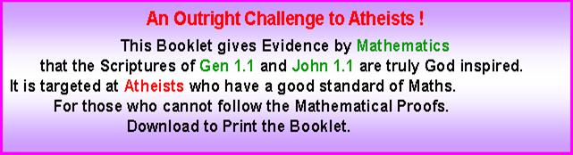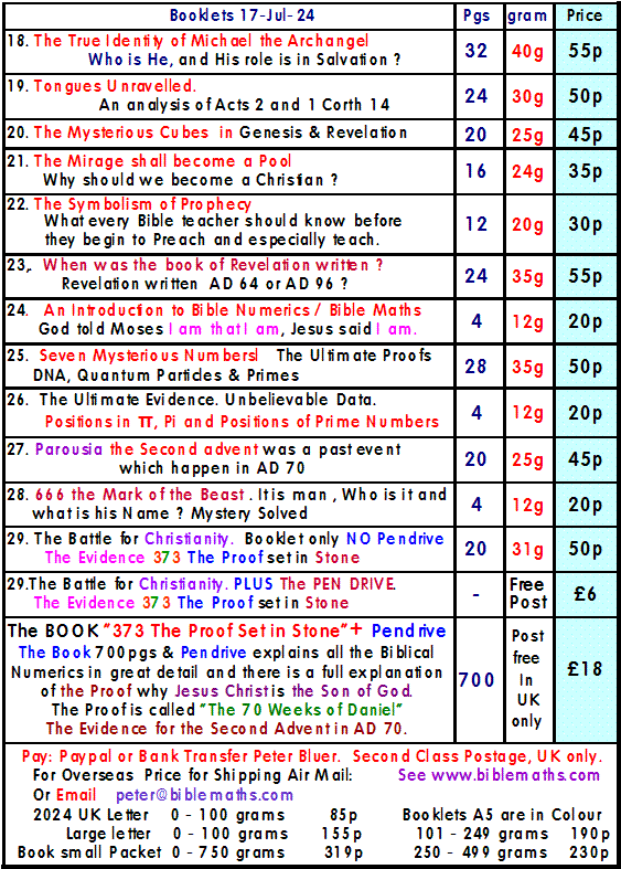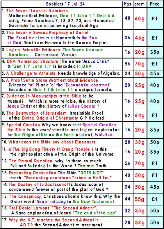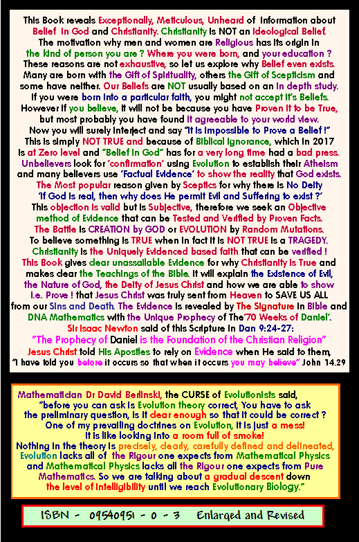Contents Section 1 Evidence from Genesis of the Deity of the Lord. Angel of the Lord. Who is he ? The Angel of the Covenant. John 1.1 in explained in detail. Testimony from the Book of Revelation. The Truth about Hell Chapters 1. The Eternal Question. Why Evil and Suffering ? 2. The Fundamental Doctrine of Christianity. 3. The exposition of John 1.1 4. More evidence from the New Testament. 5. The Plural of God in the Old Testament. 6. Who is the Angel ( Michael ) of the Covenant. 7. The Glory of the LORD 8. The Doctrine of the Holy Spirit. 9. Summary. 10. Hell Fire is it True or False ? 2 Thess 1. 1. Appendix Anthropomorphism 2. Appendix Colwell’s Rule Section 2 Mathematical proof for an unbelieving age that Genesis is the true account of the Origin of the Universe. Immutable evidence. Evidence from the Shema. Deut 6.4 and John 1.1 Chapters 11. Introduction 12. Investigation of Gen 1.1 13. Evidence in the New Testament. 14. Numerical Geometry. 15. Algebraic and Arithmetic Analysis. 16. The Shema. 17. Other Languages, English, French and German. 18. Numerical analysis of John 1.1 Numerical Geometry, Hexagons, Hexagrams The Strange Phenomena of A4 Dimensions 19. The analysis of Pi, p, 22/7, e, 2.718 Fibonnacci Numbers, DNA Protons, Bible Cubes The Greatest unbelievable Proof Ever 20. Numerology. 21. The Numerical Signature in DNA Plus Appendices Appendix A - D Mathematical Proof why Radix 10 with 3 & 7 are the only numbers that are possible for Gen 1.1 How to construct numeric sentences by Computer. Bibliography Tables, Triangular, Hexagon, Hexagram, Prime Numbers. GPS and Bible Numerics 53.373393 Latitude. The Numerical Bible Gen 1.1, John 1.1 Section 3 Clear evidence that Jesus Christ is the prophesied Messiah sent to Israel at the time of the Roman Empire. The exact time of his first appearance as prophesied by Daniel the Prophet and a New assessment of the Second Advent. This Advent took Place in AD 70. The view that the Second Coming is a past event is called the Preterist View. This Book explains Modified Preterism What is the next major event in human history ? Chapters 19. 70 Weeks of Daniel 9:24. 20. 70 Weeks verse 25. 21. 70 Weeks verse 26. 22. 70 Weeks verse 27. Appendices 1. This demonstrates what is the evidence about the date of the Apocalypse. The Book of Revelation was written in AD 68 not AD 96 2. Part A. The Revolt of Judaea from “The Early days of Christianity “ by F W Farrar Part B. The Fall of Jerusalem from “The Early days of Christianity “ by F W Farrar 3. This is to show that one year in Biblical prophecy is 360 days. 4. Table of Chronology for the beginning of the 70 Weeks 5. The four verses in Hebrew of the 70 Weeks and a Numerical Analysis 6. Chronology , Christ’s Triumphal Entry into Jerusalem 7. Who was responsible for the desolation of Jerusalem 8. Evidence, Daniel was written in the 6th century BC 9. 2nd Advent, Past Event in AD70 μελλω “Soon” 10. The Athnach of Daniel 9.25. RSV incorrect 11. Concerning the Identity of the Beast via 666 12. A summary of certain aspects of the Second advent. 13. The so called Global events at the Second Advent of Christ Rev 6. 14. Unusual extracts from Whiston’s Josephus. 15. All the scriptures concerning the Second Advent gathered together with an accompanying Chart of the events. 16. A short commentary on Matt 24, Luke 21 and Mark 13. These three chapters contain the direct Prophecy of the Second Advent as prophesied by the Lord Himself. 17. Three interpretations of Revelation, the Apocalypse of St. John. 18. Questions and objections 19. The Second Advent Prof. Lamont. ‘must read’ 20. Why I believe in Special Creation. 21. The Problem of Speaking in Tongues |